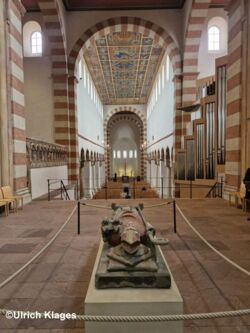 995 war Otto III. endlich mündig und konnte nun alleine regieren. Als Geschenk seiner Dankbarkeit übergab er Bischof Bernward eine Reliquie - ein Stück vom Kreuz des Herrn. Bernward stiftet hierauf eine Kapelle "zum heiligen Kreuz", die 996 eingeweiht wurde. Und Otto wurde am 21.05.996 von Papst Gregor V. in Rom zum Kaiser gekrönt.